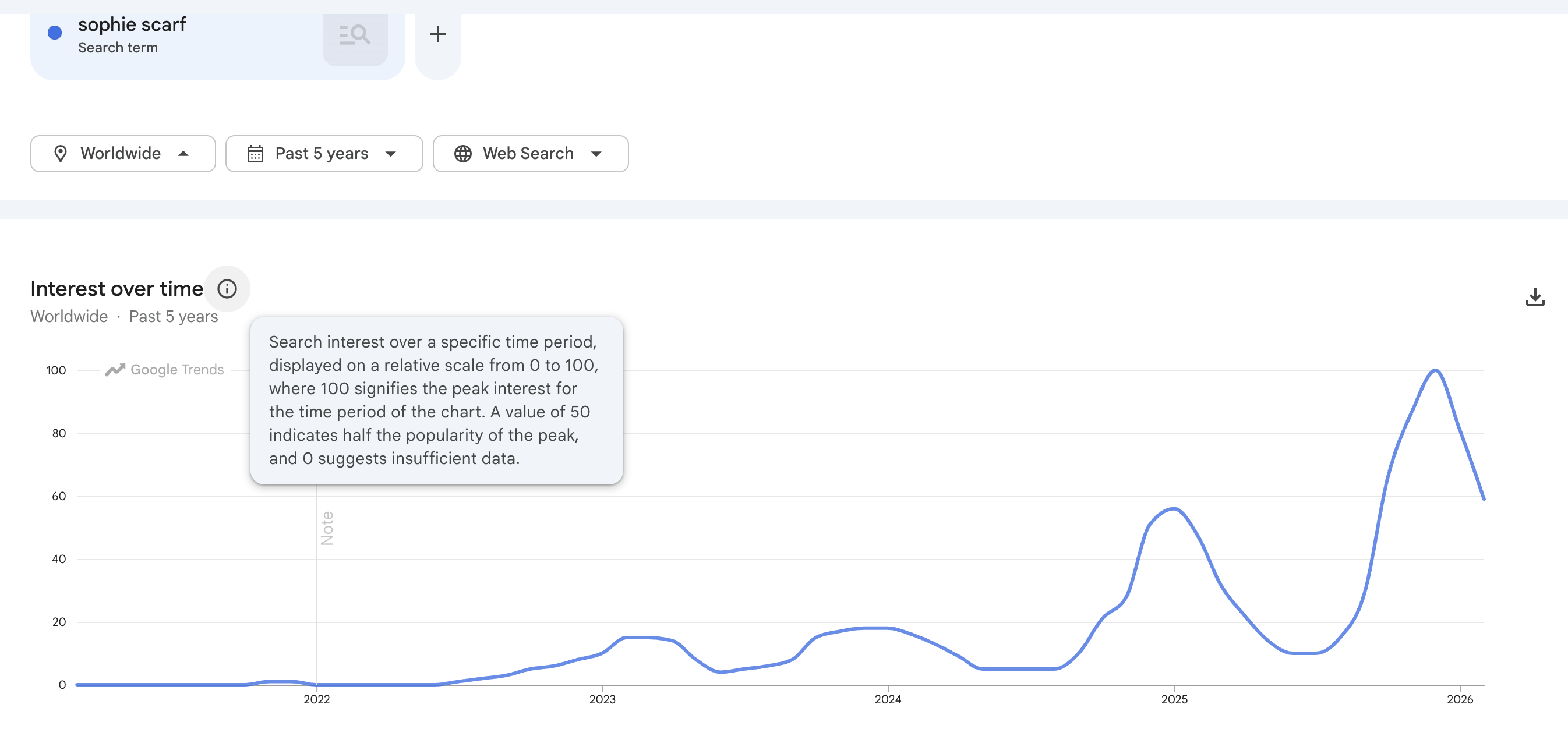 Perhaps it’s frequency illusion, but fibre arts appear to be everywhere nowadays. Based on a quick look on Google Trends: the Sophie Scarf (a simple cashmere scarf tie) had it’s peak popularity this winter season (2025) despite the pattern being release since July 2022!